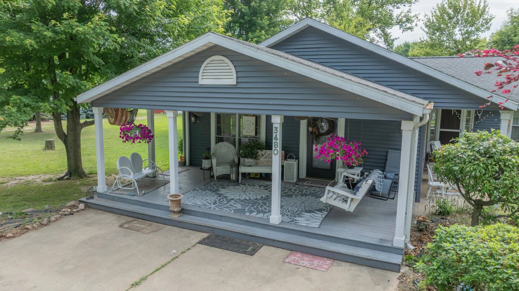 Welcome to this beautiful 3 bedroom, 2.5 bath updated home on 2 peaceful acres, perfectly located on a corner lot in Knox! Offering over 2,000 square feet of well designed living space, this property blends comfort, charm, and functionality both inside and out. Step inside and be greeted by a spacious open concept layout that flows effortlessly from the living room to the dining area and kitchen. At the heart of the home sits a custom double sided stone fireplace, creating a warm, inviting atmosphere. Large windows throughout the space bring in an abundance of natural light, brightening every corner. The kitchen features beautiful cabinetry and matching stainless steel appliances, making it as functional as it is stylish. A main floor laundry room and half bath add convenience to daily living. All three bedrooms are generously sized, including a primary suite that offers comfort and privacy. A large office area provides the perfect work from home setup and leads directly to a covered patio, ideal for quiet moments or outdoor entertaining. Outdoor living shines with a 33' above ground pool, a 24x36 pole barn with automatic opener and loft. Perfect for animals or storage. The property has a chicken coop, and raised garden beds ready for your homesteading dreams. End your day relaxing on the spacious 12x24 front porch, taking in the peaceful country setting. This Knox gem is move in ready and waiting for you to call it home!