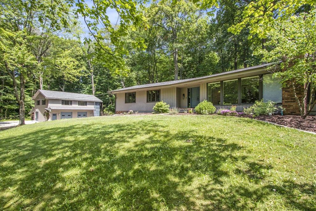 EXCEPTIONAL 4-Bed/3-Bath CUSTOM-BUILT HOME nestled on 8.7 acres, offering privacy, professional landscaping, a winding driveway, and wooded natural surroundings--making for the perfect setting. Thoughtfully designed and well-appointed throughout, the main living and dining rooms boast beamed-vaulted ceilings, a 2-way fireplace, floor-to-ceiling windows, hardwood floors, and an inviting tiled foyer.The spacious gourmet kitchen features a granite-topped island, Viking range, SS appliances, a walk-in pantry, and dining area with sliders leading to a versatile porch with wood burning stove, and Sunscape windows that open to convert the space into a screened porch - when closed, the interior is protected from the weather. Step outside to a large custom patio and walkway that extends the living space into the tranquil outdoors. The main floor also includes a spacious primary bedroom with built-ins and en-suite featuring an Italian freestanding soaking tub, plus two additional bedrooms and a full bath.The walk-out lower level has daylight windows, a 2nd fireplace, pool table area, built-in wet bar, the 4th bedroom, bathroom, and a hobby/storage room. One of the home's most unique features is a 2-story 22' x 23' INDOOR BASKETBALL COURT. Additional amenities include generous closet space, a 2-car integrated garage, alarm system, many newer Pella windows, and outdoor sprinkler system.PLUS, A RECENTLY CONSTRUCTED 2-STORY DETACHED GARAGE--originally designed as a woodworking shop--with heat. The finished upper level includes a living room (with potential to add a kitchen) and is prepped to accommodate an elevator. It also features a bathroom, a bedroom, and a stunning library wall with a sliding ladder and handcrafted trim made from trees on the property. A back deck with stairs overlooks the yard and wooded area. Attached behind the structure is a large covered carport. Note: All information is believed to be accurate; buyer(s) to verify all details.