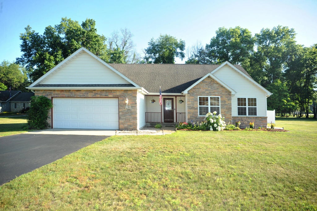 Welcome to this beautifully maintained 3-bedroom, 2-bathroom ranch situated on a serene 1.09-acre lot with a private, wooded backyard view. This home offers a warm and inviting interior featuring hardwood floors, cathedral ceilings, and a cozy fireplace. The spacious kitchen includes all appliances, and the main level laundry adds everyday convenience. Enjoy peaceful mornings on the covered front porch or relax on the back patio overlooking the partially fenced yard. The primary suite features a tray ceiling, walk-in closet, and a private ensuite bath. Solid six-panel wood doors and ceiling fans throughout add both quality and comfort. A 2.5-car attached garage and storage shed provide ample space for tools and toys. Don't miss this quiet retreat that offers both privacy and practicality.