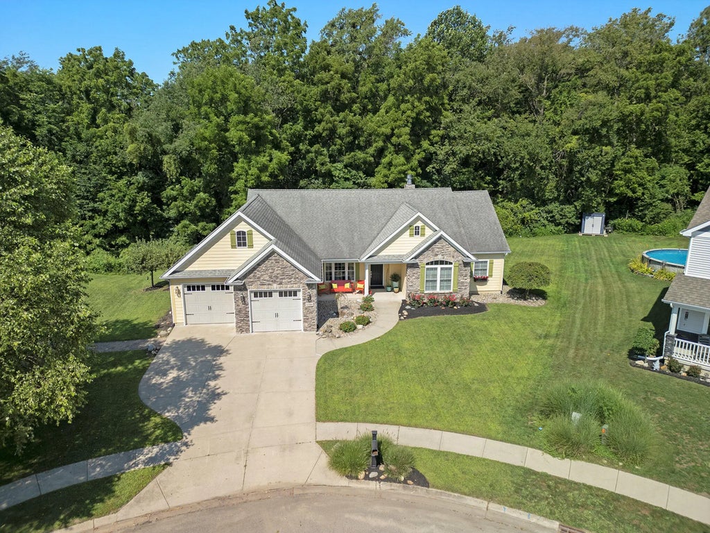 Custom Built fully Accessible Ranch on a Perimeter Wooded Pond Lot! Zero barrier entry home with VA approved design. You'll fall in love with this open-concept from the moment you enter with sweeping cathedral ceiling, solid wood floors & stone FP. Loads of sunlight from the rear windows overlooking the private wooded lot or enjoy morning coffee at the pond. Built with ease in mind offering everything you need on the main floor plus a 3rd bedroom & bath in upper loft. Primary suite comes with wood floors, FP, on-suite w/walk-in shower. High quality features include high-efficient furnace, LoE double pane windows, & blown-in insulation to save your utility bill. Located just 3 minutes from the Indiana toll-road and just 1 hour from Chicago in the desirable University Village community. All of this and NO HOA! Call today!