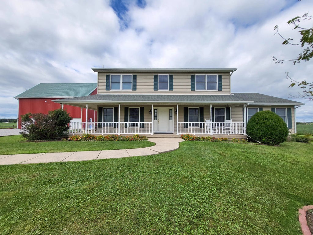 Situated on five acres, this 5 bed, 4 bath home on a full basement comes complete with a massive barn (1472 sq. ft.) large enough for 3+ cars, large rear deck out to the swimming pool, scenic views with mature trees in all directions, and much more. As you enter the home you are greeted with tall ceilings in the spacious foyer. On the main level you will find the kitchen with all appliances included, full size pantry, and counter seating for four. Adjacent to the kitchen you will find the dining room with access to the rear deck. The living room offers plenty of space for entertaining, while an additional great room in the front of the home lends an additional space for even more options to customize your space. Laundry with washer and dryer included as well as the primary bedroom can also be found on the main level. The primary bedroom is spacious with dual windows, ceiling fan, walk-in closet, and large ensuite bathroom including dual sink vanity, walk-in shower, whirlpool tub, and linen closet. Upstairs you will find four additional bedrooms and two full baths. The full-size basement offers plenty of storage space and includes a two-year-old hot water heater, three-year-old furnace, OSBY reverse osmosis water system, and a hardwired security system. The barn includes three garage doors, a second floor with an abundance of storage space, a rear storage area complete with multiple doors and garage door perfect for lawnmower access. The barn also features steel siding, metal roof, and plenty of windows. The large driveway can accommodate many vehicles with the additional parking area in the front. Exterior features include a wraparound porch and large rear deck with pergola with above ground swimming pool fully fenced in with multiple gates.
