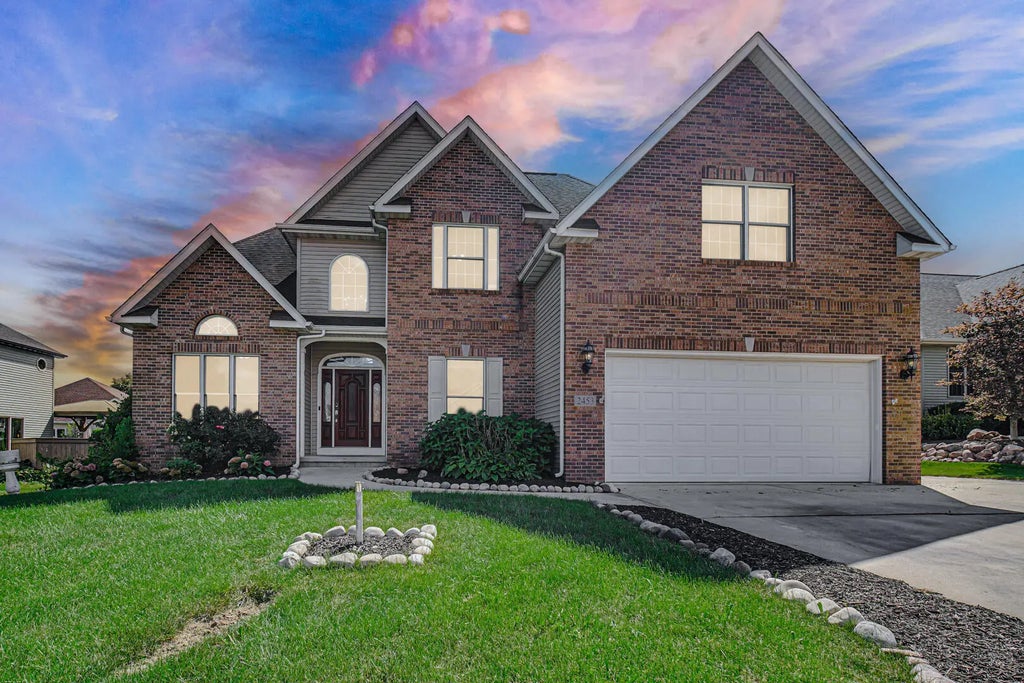 Did you miss out on the 2 story down the street? Don't worry! Now is your chance to grab this stunner! Welcome to this beautifully crafted, meticulously clean, freshly painted 4-bedroom, 3.5-bath brick home in the prestigious Emerald Ridge subdivision & w/in the top rated Valparaiso school system. This two-story gem w/ its vaulted entry foyer features custom cherry hardwood flooring throughout the foyer & kitchen/dining area that adds timeless elegance throughout the main floor living areas. The gourmet kitchen is spacious, functional & refreshed complete w/ brand new stainless steel appliances, spectacular cherry kitchen cabinets, sparkling quartz countertops, & a stylish tile backsplash--perfect for everyday living & entertaining. The spacious living room w/ elevated ceilings & a cozy fireplace flows seamlessly to the dining area & outdoor space. Sliding glass doors open to the expansive private retreat ideal for relaxing & entertaining w/ an oversized composite deck, large concrete patio, & a fully fenced backyard that backs up to serene lush green space currently owned by the homeowners association. The main-floor master suite w/ a luxurious whirlpool tub, separate shower, private toilet, & a spacious walk-in closet offers comfort and convenience. The open concept layout includes a formal office off the front foyer which makes working from home a breeze & a convenient main floor laundry room. The fully finished daylight basement with elevated ceilings provides a large recreation area & an additional full bathroom perfect for entertaining or multi-generational living. Upstairs you'll find three oversized bedrooms & another full bath w/plenty of space & privacy for the whole family. The 2.5-car attached garage includes an entryway w/ a half bath for added convenience. For peace of mind, the seller is including a 1Yr home warranty at no cost to the buyer. Don't miss your opportunity to own this exceptional home in one of Valparaiso's most desirable neighborhoods
